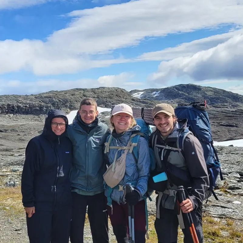 What an odd last day. Doesn't feel quite as consequential as ending 33 days in the Pyrenees — in part due to the length but also knowing there's still a week to spend here in Norway. Still, it was hard to say goodbye to our trekking neighbors after finally getting to really know them. We saw the Germans thrice today: first when they passed us as we were just waking up, second when we passed them as they were snacking against a cabin, sheltered from the frigid winds of today (which is when we snatched a picture.) The Norwegians were more elusive, but we were just as happy to see them in Finse where we all met one last time. Truly generous, Lars bought Mathilde and I a beer (alcohol is very expensive in Norway), and "Grumpy" gave us good recommendations for our remaining trip.