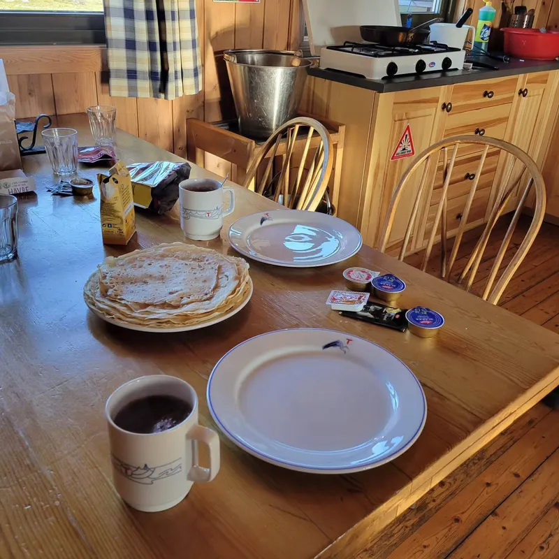 The cabin was the final highlight, fully furnished with sinks, warm water, flushable toilets, a shower! And yet somehow, no one else. We make soup as entree followed by pot-au-feu (also soup) and then a new desert: fruit soup. We didn't think this through very much, but it tasted great okay..?
