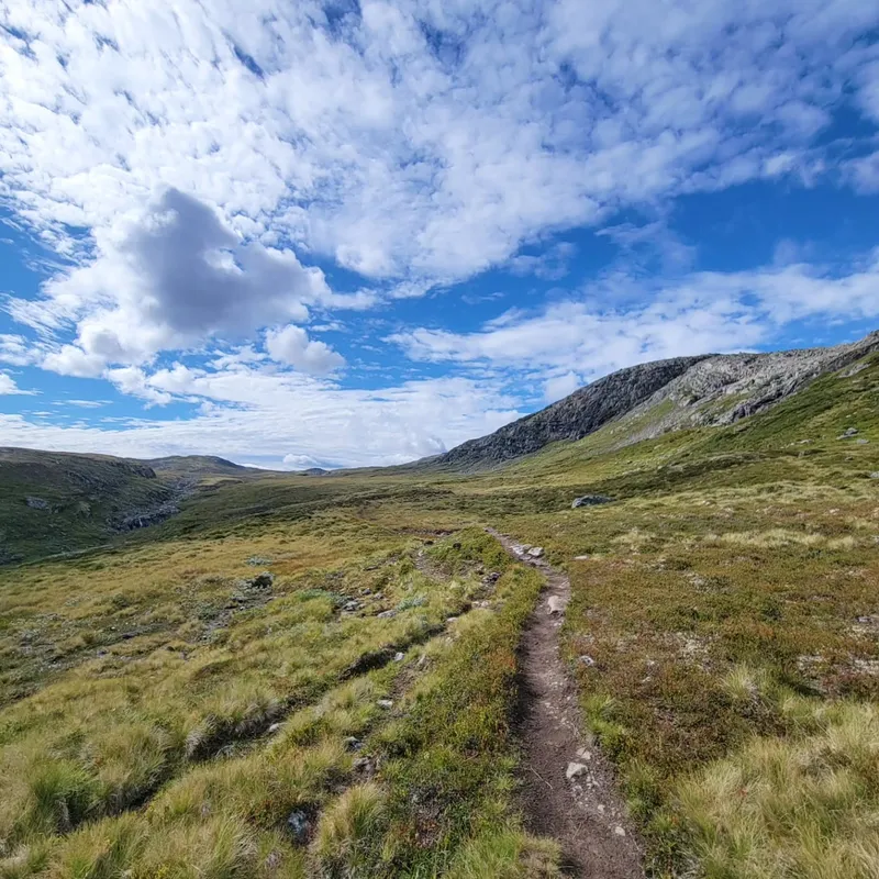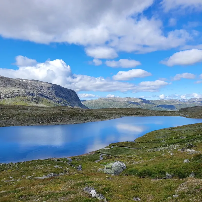 The weather quickly turns to a dry but slightly windy and cloud-less day — perfect for hiking — as we trek down repetitive sights of lakes and rocky paths. We're quickly glad as the altitude lowers to see some trees again, before eventually reaching a tiny village. There, we see an adorable little Scandinavian church (nothing like those we're used to) and meet a French girl doing Massiv the other way. We exchange insight on each other's future hikes and part ways after a 20min chat.