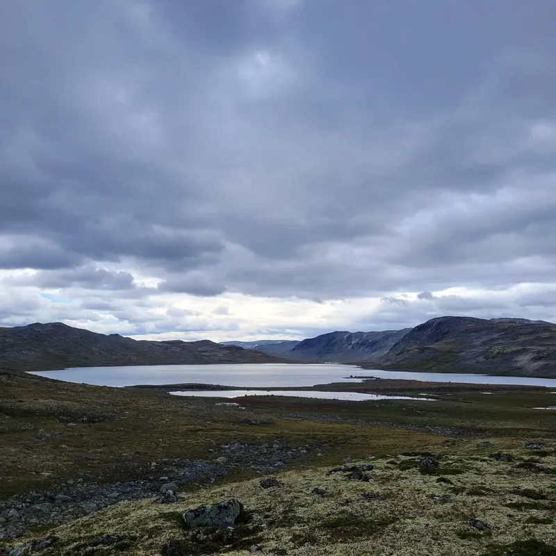 Upon reaching the cabin we meet people coming the other direction. They say reindeers are very common in this park, so hopefully, I'll get to snatch better pictures. Although this cabin wasn't as cute, it was next to a lake and a massive cloudberry field, so we picked a bunch of them and showered in the lake.