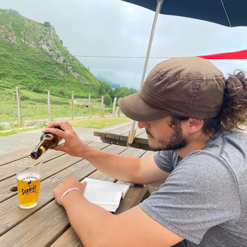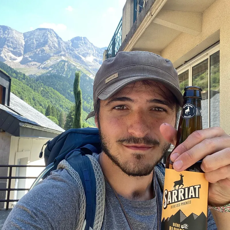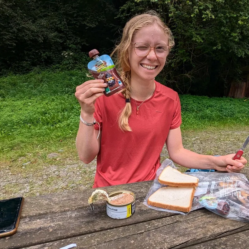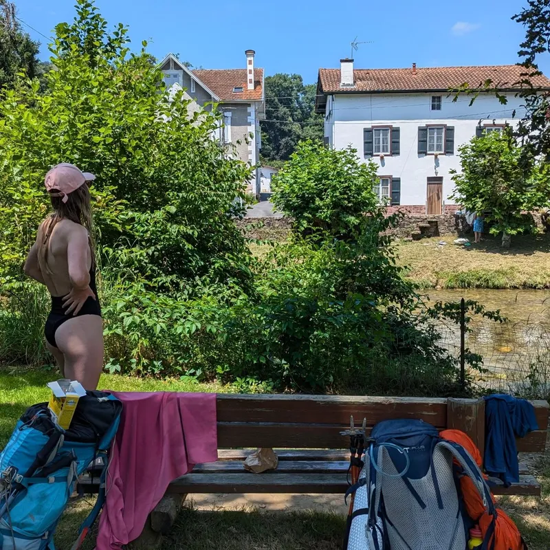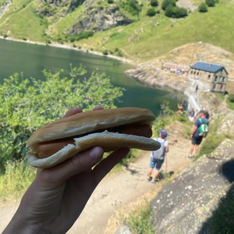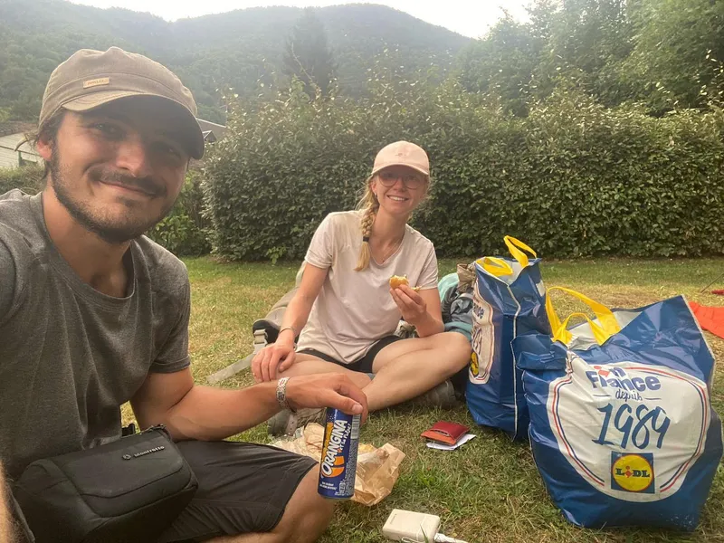 Instead of staying at a cabin where we were greeted by an angry Patou, we made it to a lake further away where we saw our friends from the day prior. I (Ixil) drank a pint, Mathilde a lemon syrup and sneaker bars, and we all went down for a swim in the lake.