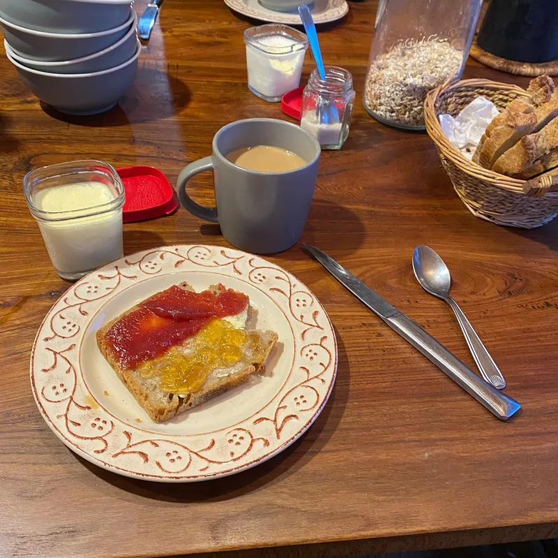 We are super happy that we chose this gîte. It is a farm owned by a couple who run the place off of trust. The dinner was tasty: an entrée, wine, a rougaille Saucisse for the main, cheese, and homemade icecream. The veggies came from their garden. They also have adorable dogs who would politely ask for pets.